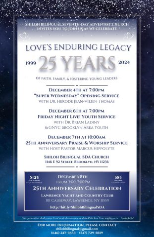 It’s finally here—the end-of-year celebration we’ve all been eagerly awaiting! The Lord has brought us through so much, and now, Shiloh Bilingual Seventh-day Adventist Church is celebrating 25 wonderful years. Join us for a weekend filled with praise, worship, and the highly-anticipated anniversary celebration! Whether you're an old friend or new, we would be thrilled to have you with us.